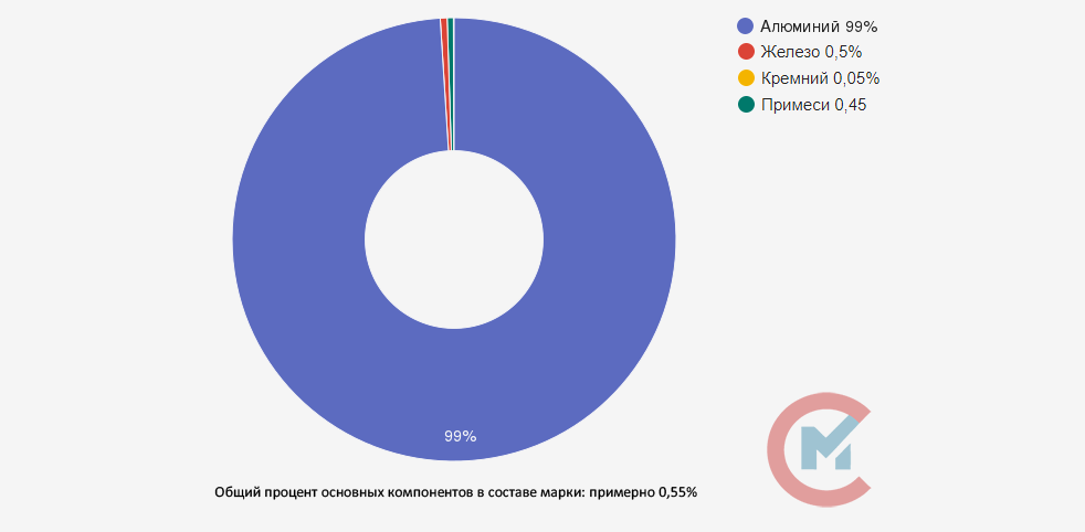 Содержание алюминия в сплаве составляет 99%, оставшийся процент делят между собой: железо до 0,5%, кремний до 0,05%, титан до 0,03%, медь до 0,02% и цинк до 0,08%. Прочие примеси до 0,03%. Количество примесей регламентировано ГОСТ 11069-2001.