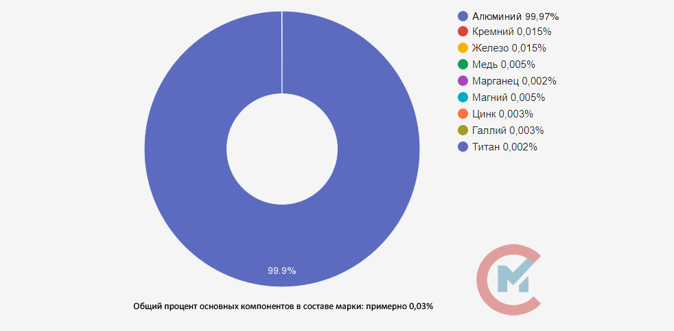 Первичный алюминий обозначается буквой А в маркировке, число 97 относится к значению после запятой в проценте алюминия, содержащегося в сплаве (99,97%).
